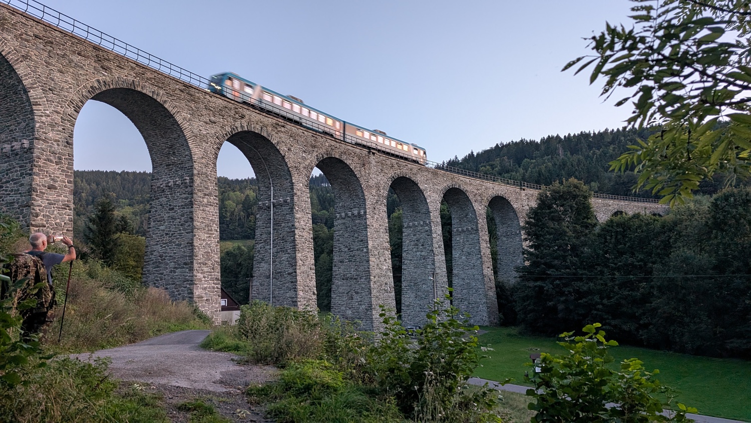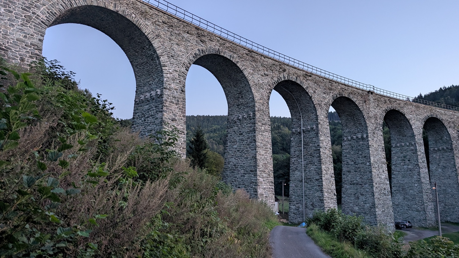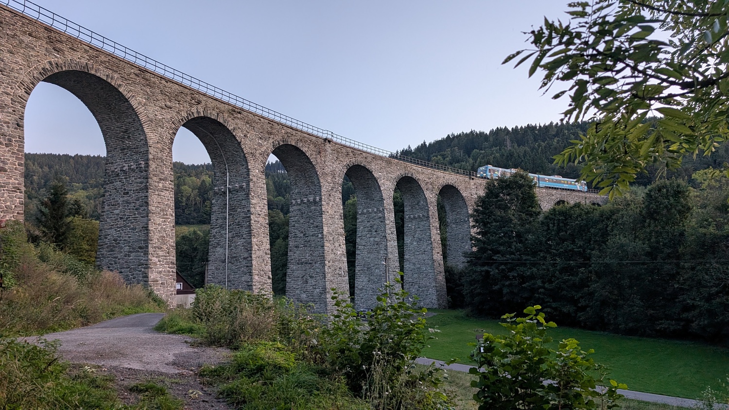 parapety mostu byla použita liberecká žula. První vlak od České Lípy projel po kamenném mostě u Noviny 16. září 1900, dojel ovšem jen do Horního Růžodolu, protože liberecké nádraží bylo v té době v rekonstrukci.