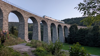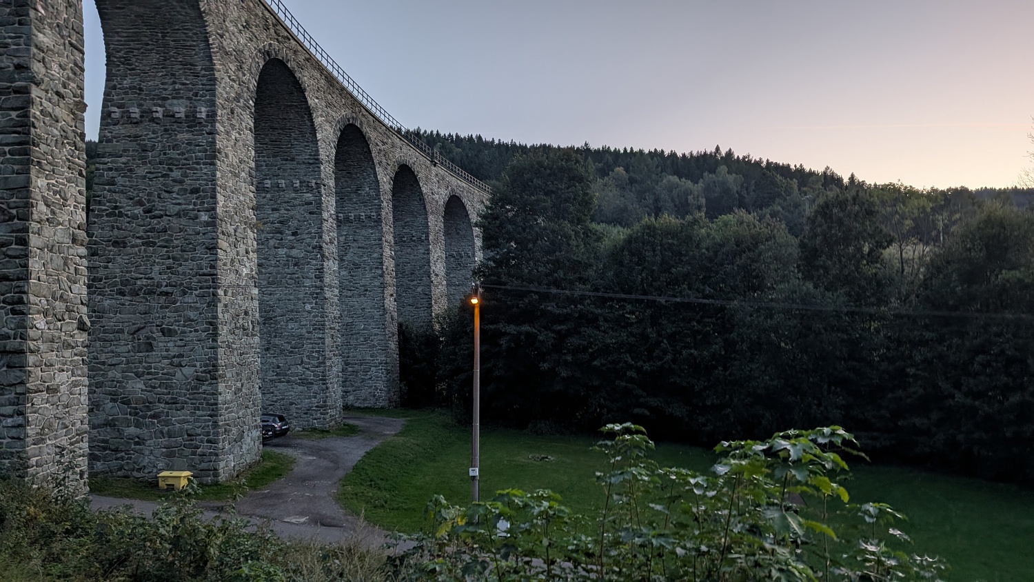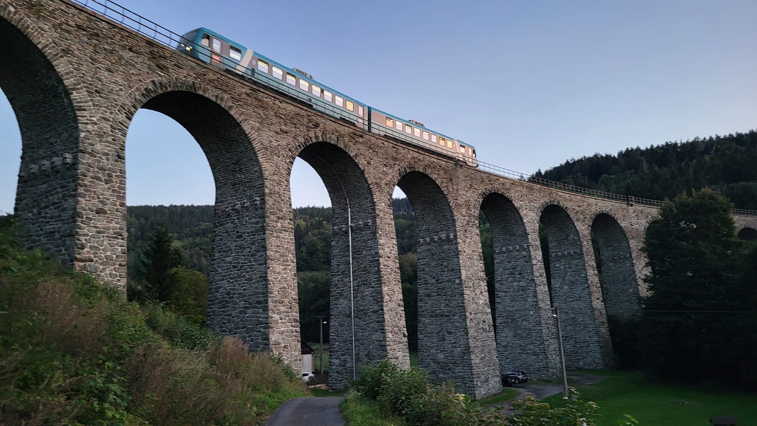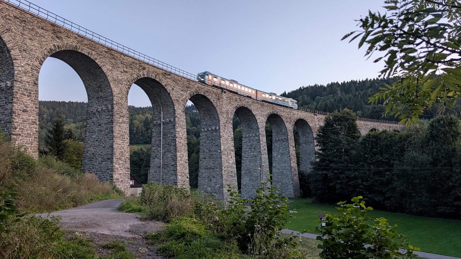 parapety mostu byla použita liberecká žula. První vlak od České Lípy projel po kamenném mostě u Noviny 16. září 1900, dojel ovšem jen do Horního Růžodolu, protože liberecké nádraží bylo v té době v rekonstrukci.