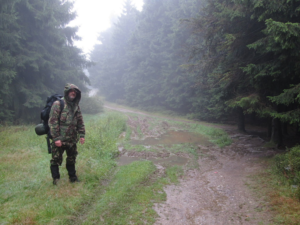 A je to tady. Prší a to celou noc. Ještě že máme stan. V mrholení a vichru z hor balíme. Mrznou nám prsty, a tak dochází i na rukavice. Je zima a ponuro. Úplně jak na vraždu, konstatuje náčelník. Míříme opět do Německa a to na Kammhöhe a pak na Hvozd 750 m.n.m. Cestou na Hvozd se spustí průtrž mračen. Schováváme se pod zdejšími mohutnými buky, ale vody je tolik, že dojde na nejhorší. Musíme vybalit pláštěnky a nandat návleky. Pak v nepřehledné situaci dojde k logistické chybě a my ze žluté značky sejdeme na červenou hraniční a rázem to máme na Hvozd delší, ale za to horší cestou. Konečně opět žlutá a my pokračujeme dál na vrchol. Už neprší, ale bloudíme v mlze. Konečně chata a je otevřená. Jdeme se ohřát a čekat na lepší počasí. Kolem poledne se počasí umoudřilo a my pokračujeme k rozhledně Hochwald. Zde pokračujeme po modré DE, ale nastává problém. Místní dřevaři cestu uzavřeli kvůli těžbě buků. Když narazíme na první lesácký traktor, tak se těžbě za rachotu motorových pil a padajících buků vyhneme. Rychle se orientuji v terénu a v neprostupném pralese určuji směr a dostatečnou vzdálenost od padajících stromů. Po vzoru diverzních jednotek neviditelně procházíme místem těžby, abychom za 200 m našli opět modrou značku. Les je to nádherný, a tak fotím několik snímků. Náčelníkovi po této dobrodružné vložce vyhládlo, a tak v lese i poobědváme. Po krátkém odpočinku pokračujeme na místo zvané Sudetenblick a dále po zelené opět do Čech. Pokračujeme pod Loupežnický vrch, Pekařův kříž přes a Bílé kameny** do obce Jítrava. Cestou potkáváme pěkné bunkry a slony